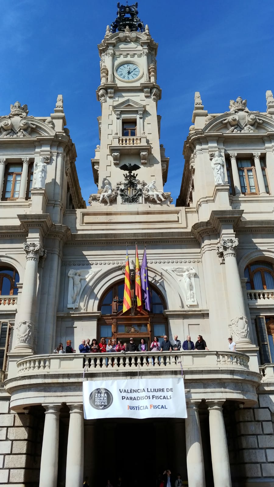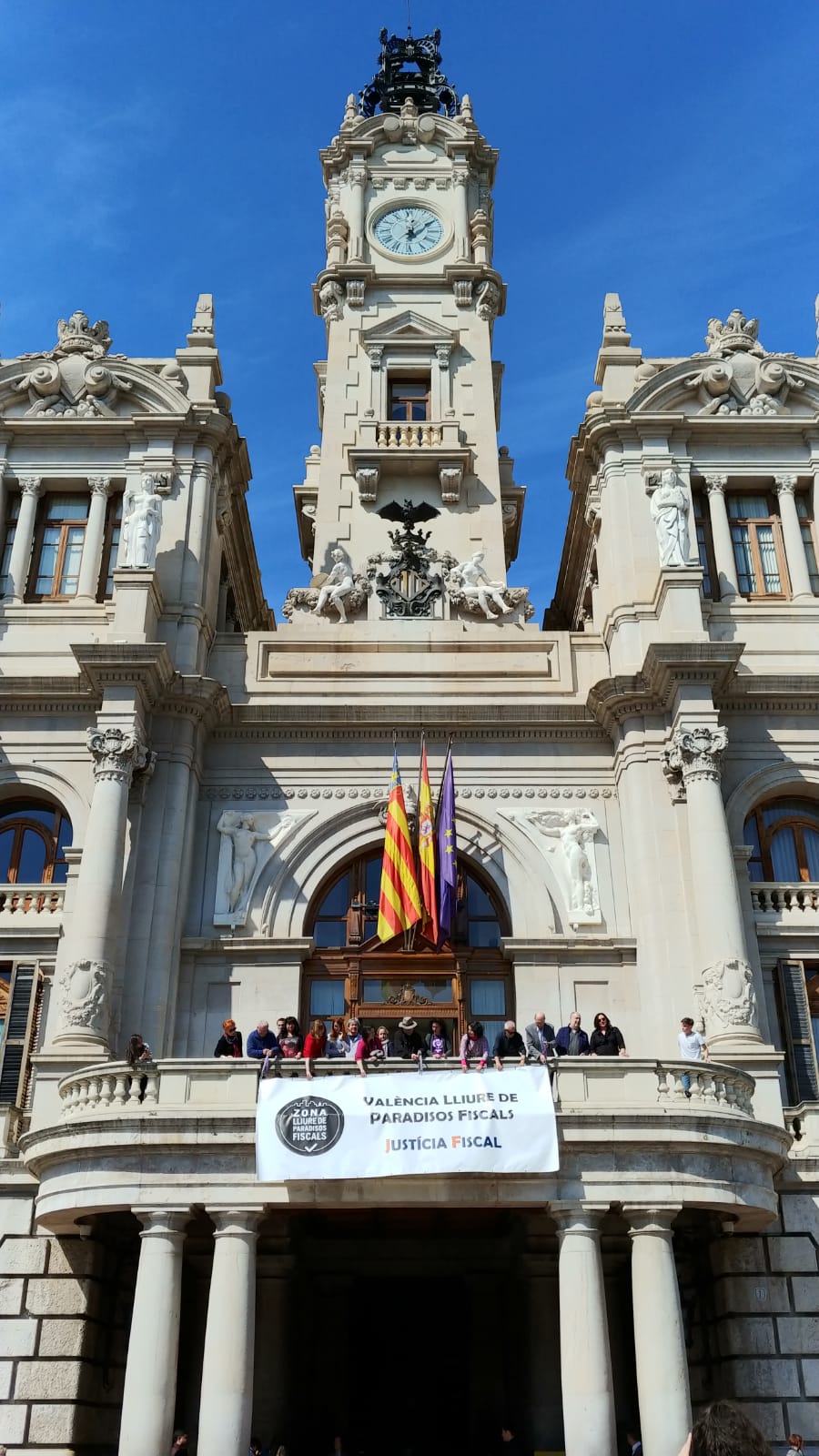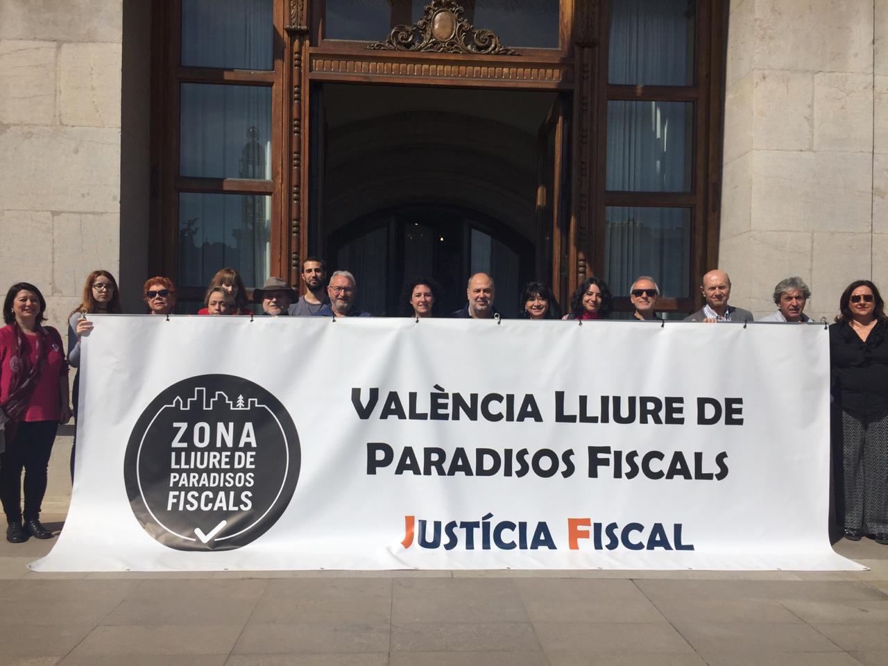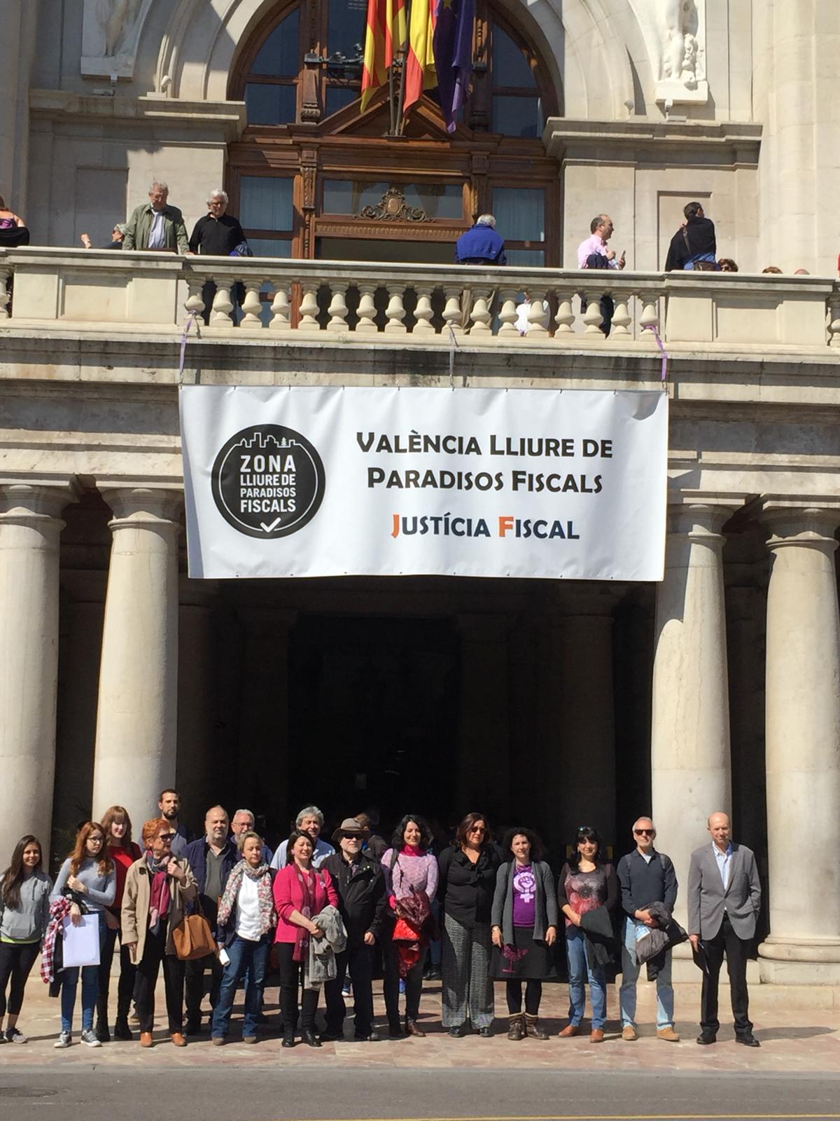 Uno de los actos fue el despliegue de una pancarta desde el balcón del Ayuntamiento de València, gesto con el que las organizaciones miembros de la Campanya per una Justícia Fiscal reconocen los avances dados por el Ayuntamiento con la reciente aprobación de la ‘Instrucción de contratación pública responsable’, que incorpora cláusulas de responsabilidad fiscal que deberán cumplir las empresas que contraten con el Consistorio. Este paso pone en marcha la aplicación de la moción que en octubre de 2016 declaró a la ciudad de València libre de paraísos fiscales.