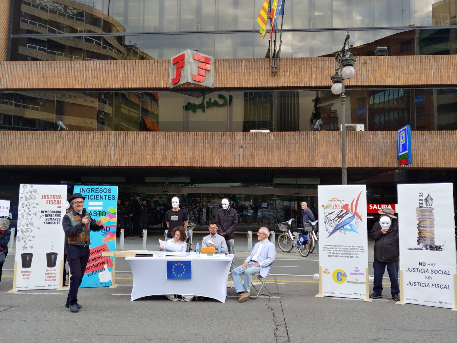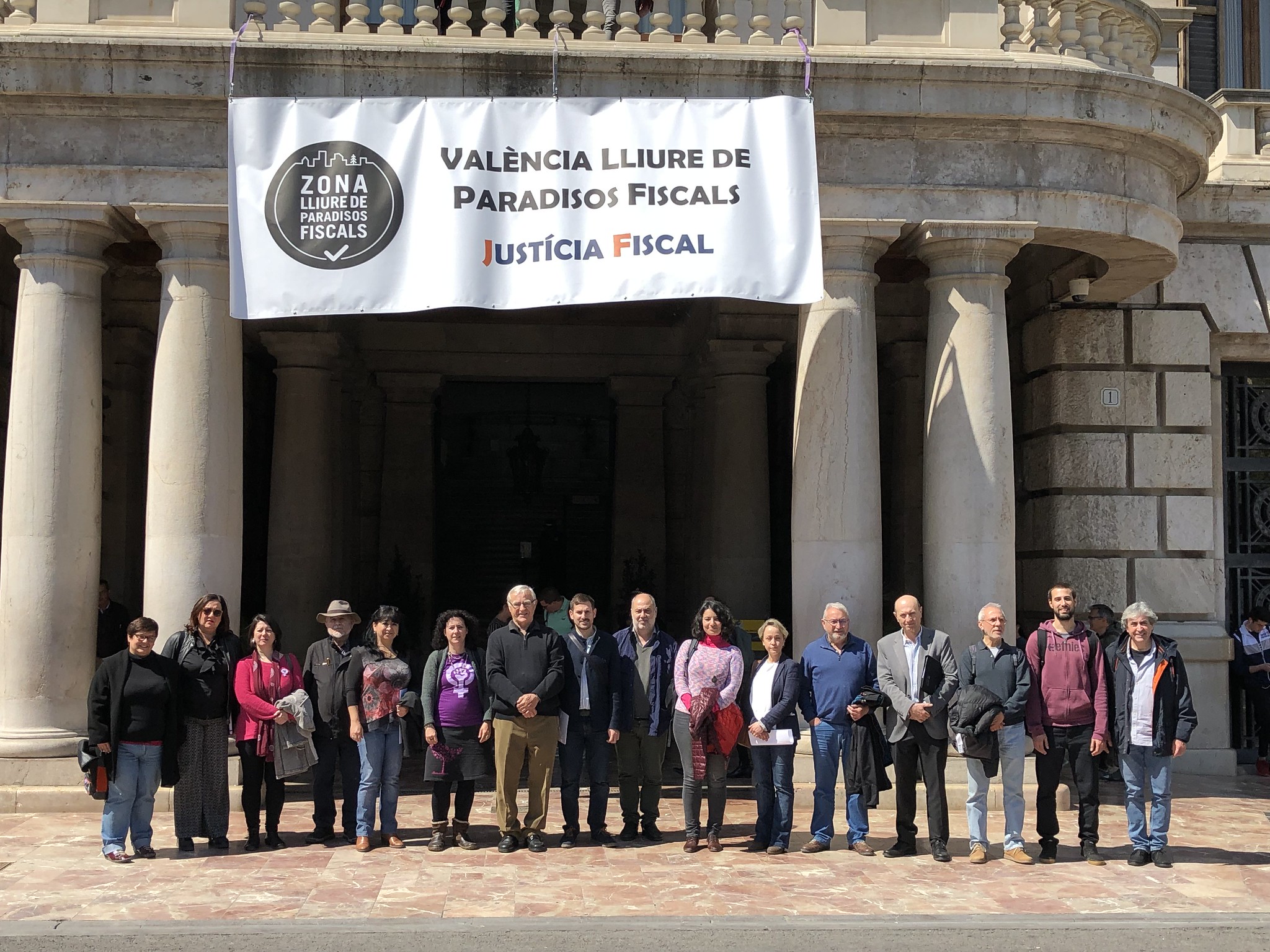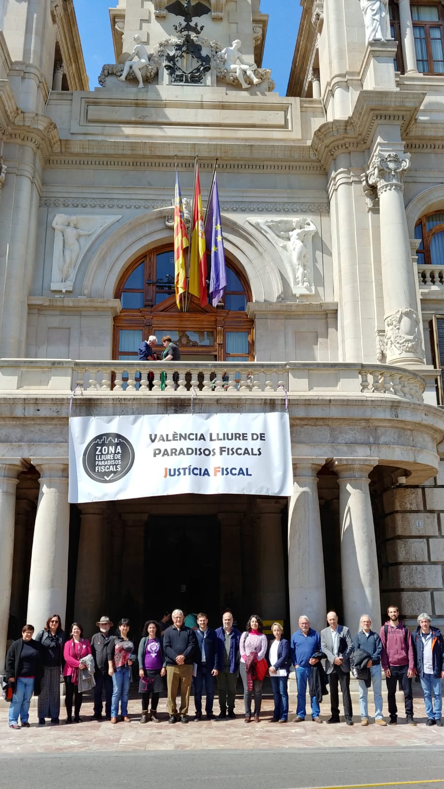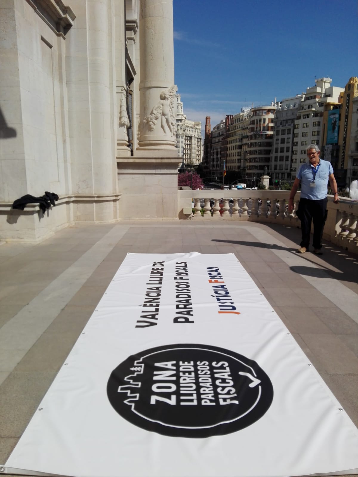 Uno de los actos fue el despliegue de una pancarta desde el balcón del Ayuntamiento de València, gesto con el que las organizaciones miembros de la Campanya per una Justícia Fiscal reconocen los avances dados por el Ayuntamiento con la reciente aprobación de la ‘Instrucción de contratación pública responsable’, que incorpora cláusulas de responsabilidad fiscal que deberán cumplir las empresas que contraten con el Consistorio. Este paso pone en marcha la aplicación de la moción que en octubre de 2016 declaró a la ciudad de València libre de paraísos fiscales.