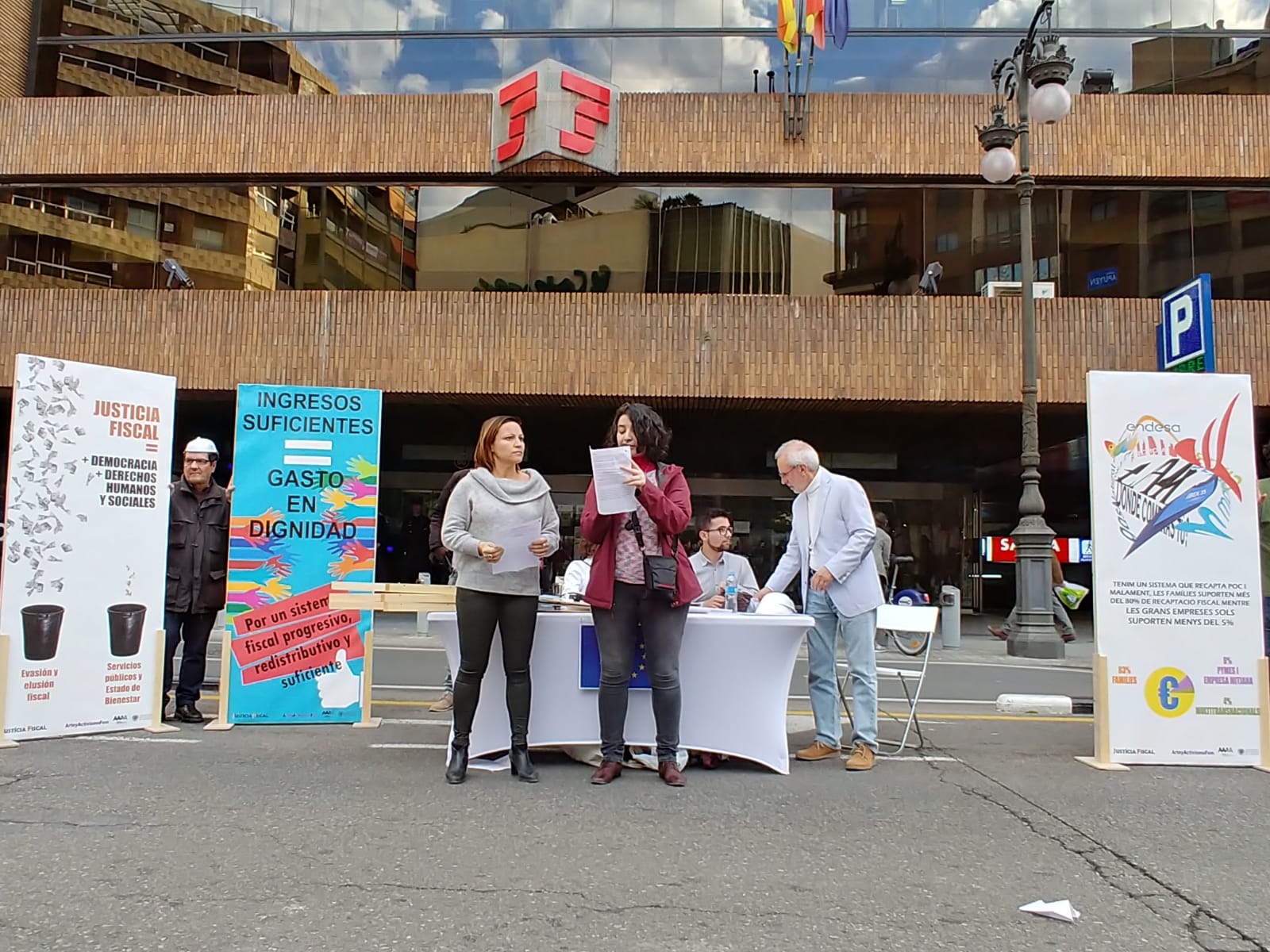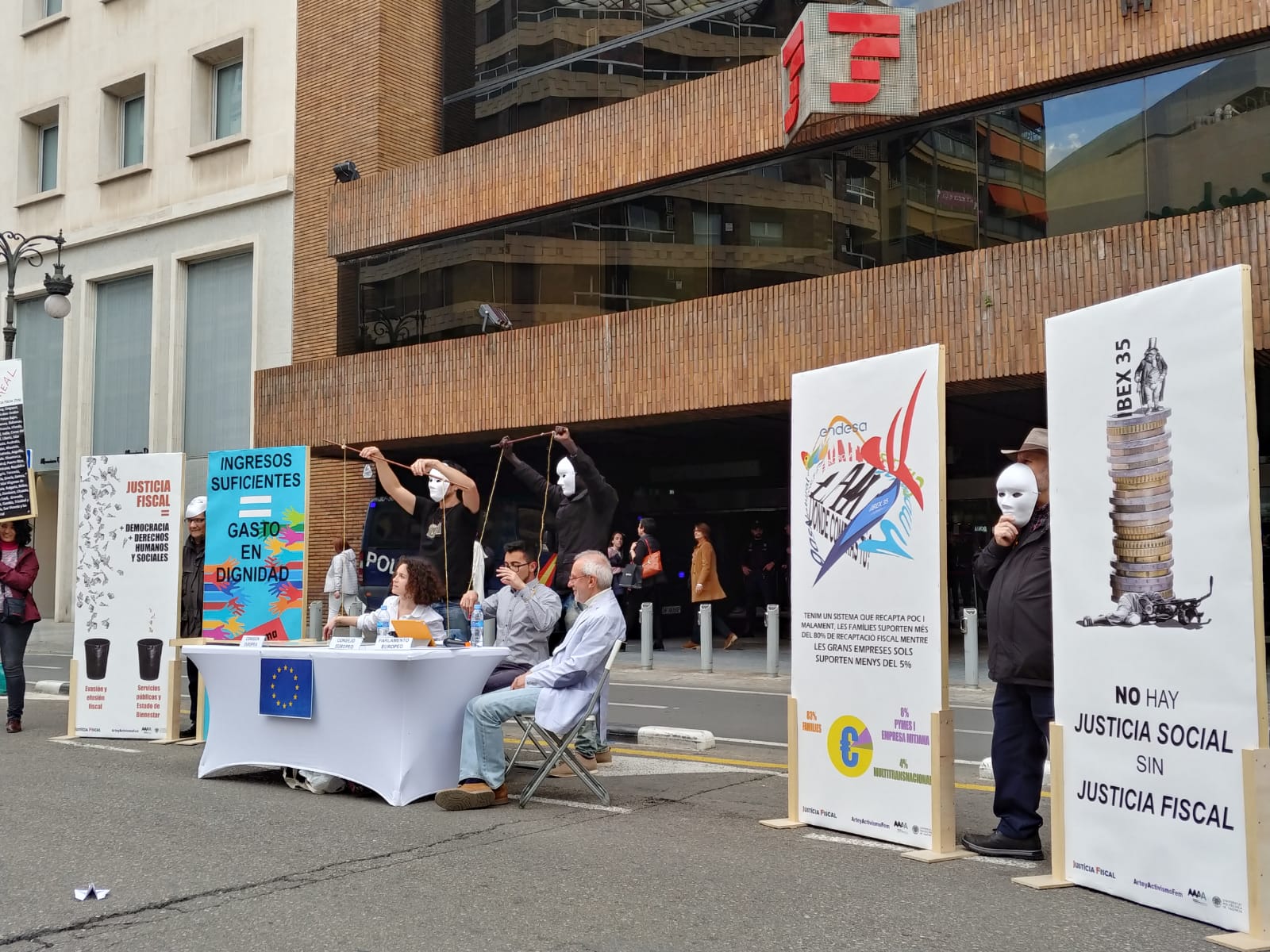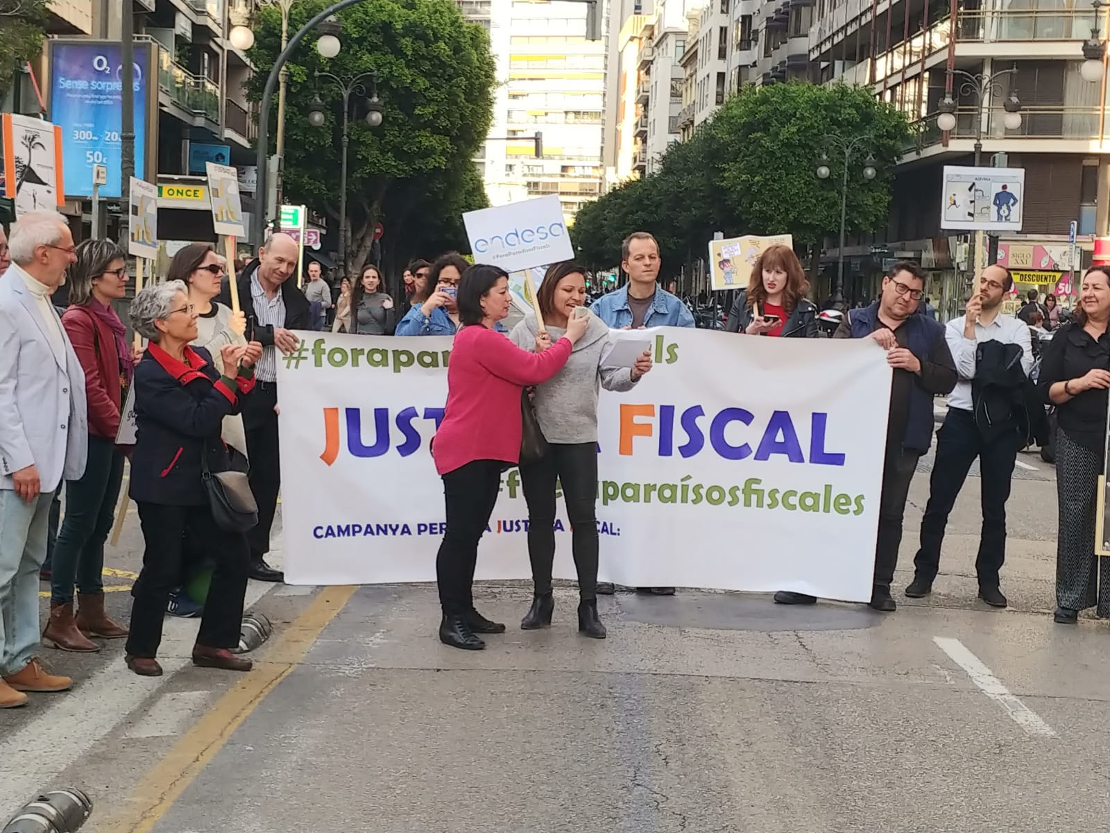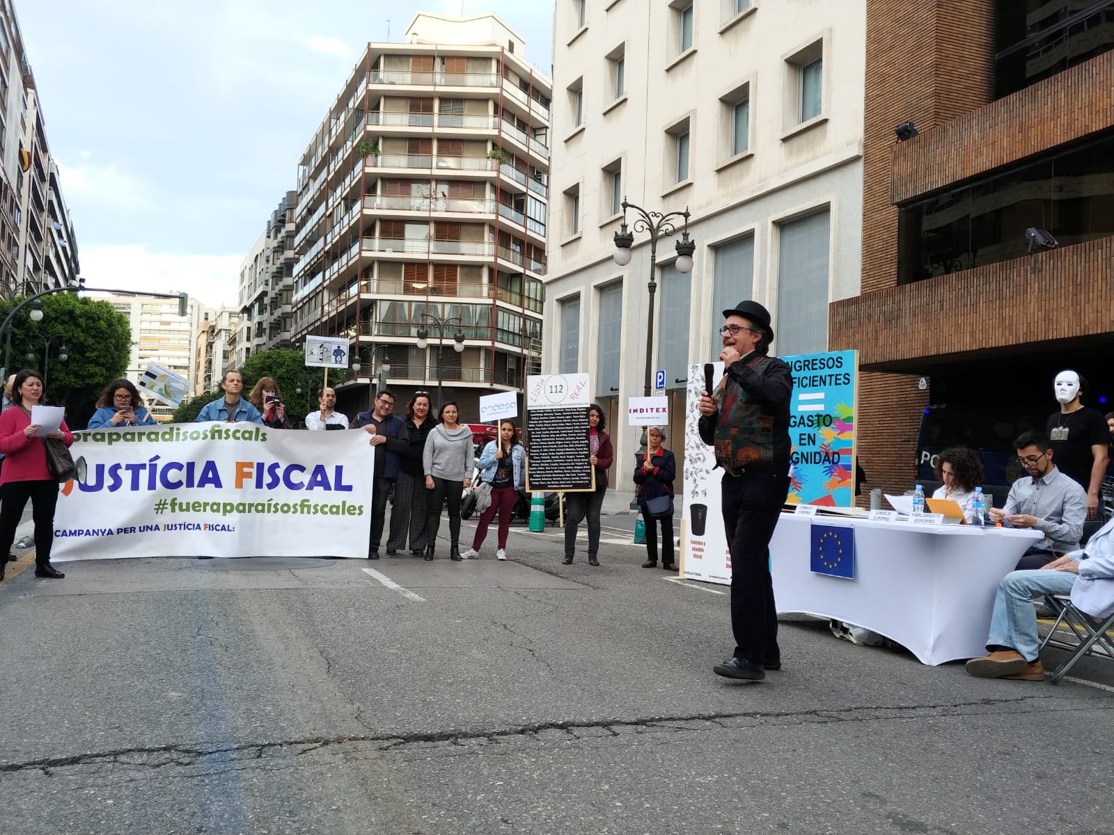 Uno de los actos fue el despliegue de una pancarta desde el balcón del Ayuntamiento de València, gesto con el que las organizaciones miembros de la Campanya per una Justícia Fiscal reconocen los avances dados por el Ayuntamiento con la reciente aprobación de la ‘Instrucción de contratación pública responsable’, que incorpora cláusulas de responsabilidad fiscal que deberán cumplir las empresas que contraten con el Consistorio. Este paso pone en marcha la aplicación de la moción que en octubre de 2016 declaró a la ciudad de València libre de paraísos fiscales.