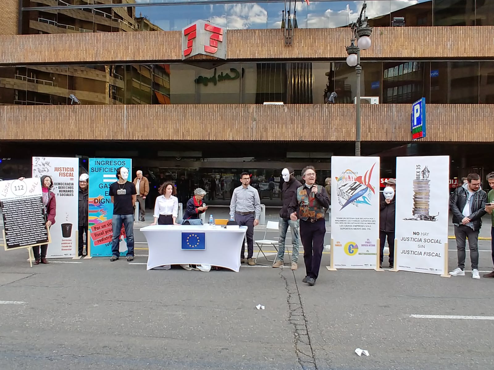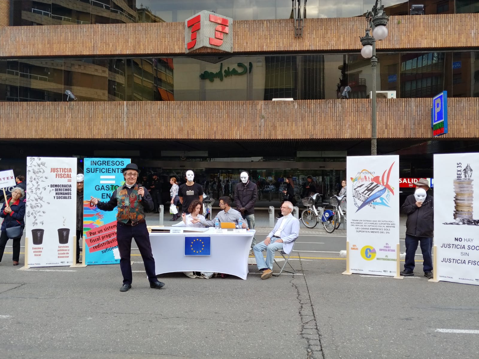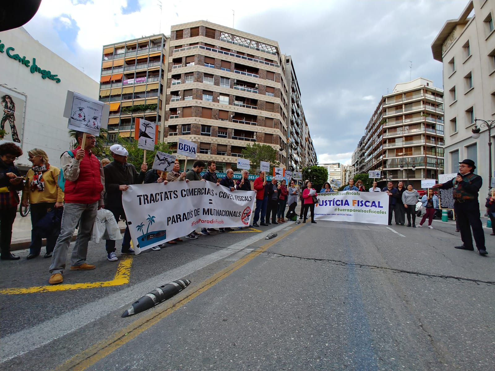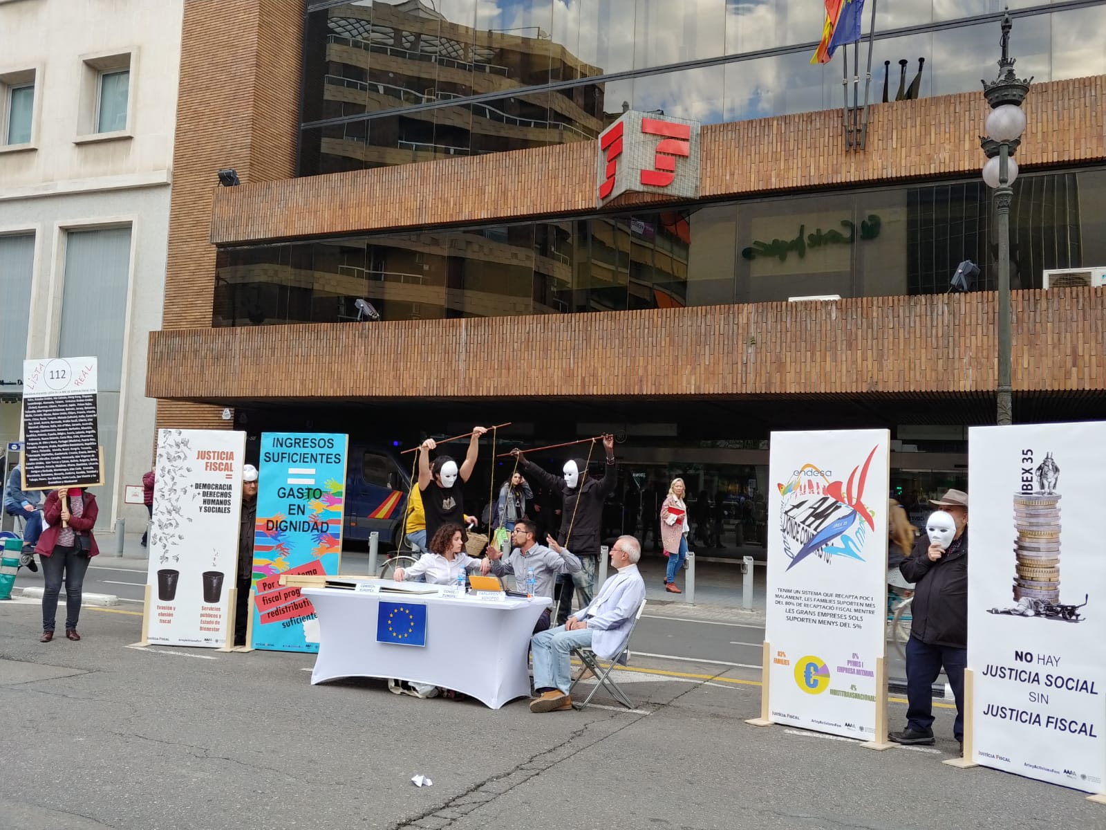 Uno de los actos fue el despliegue de una pancarta desde el balcón del Ayuntamiento de València, gesto con el que las organizaciones miembros de la Campanya per una Justícia Fiscal reconocen los avances dados por el Ayuntamiento con la reciente aprobación de la ‘Instrucción de contratación pública responsable’, que incorpora cláusulas de responsabilidad fiscal que deberán cumplir las empresas que contraten con el Consistorio. Este paso pone en marcha la aplicación de la moción que en octubre de 2016 declaró a la ciudad de València libre de paraísos fiscales.