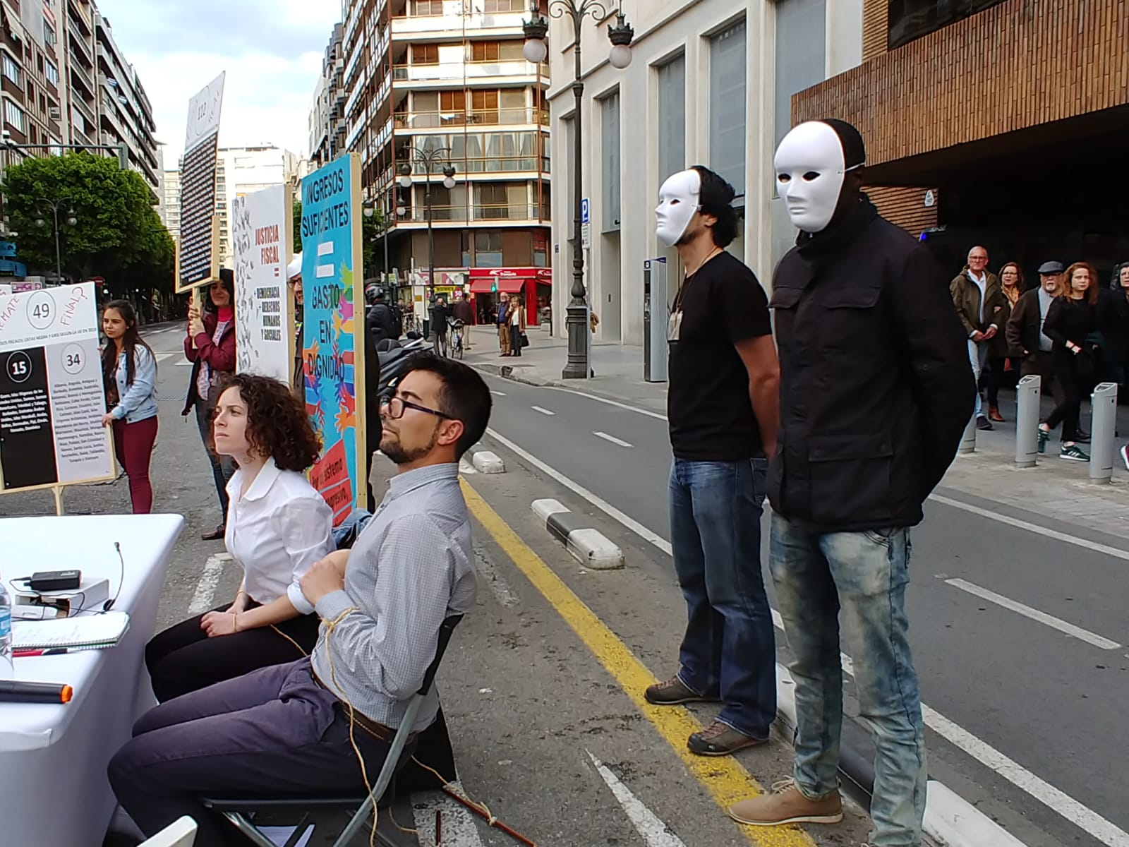 Otra de las actividades fue la concentración y performance que se realizó en la Plaza de Los Pinazos. Presentamos ‘La increíble historia de las vergonzantes listas menguantes’, dirigida por el actor Vicente Cortés, que nos condujo a un escenario imaginario pero muy cercano a la realidad, de como los organismos de la Unión europea deciden sobre las listas negras y grises de países y territorios considerados paraísos fiscales.